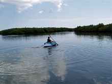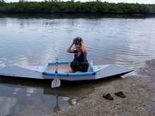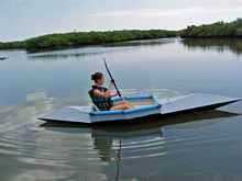 I make a date with my first mate to serve as test pilot. She tries out the test pilot helmet but claims it is not needed, as she will not take the Stealth Yak up on plane. The front module stays dry and what we can see of the stealthy craft appears to float and maneuver well. Only one man and three dogs appeared in the test area. They were all sworn to silence and allowed to leave. This fun craft will not be seen on the east coast of Florida due to its stealthy design but it was a joy to build. The first mate calls it a cool boat and has nicknamed it yakety yak from the famous song by the COASTERS (ask grandpa).