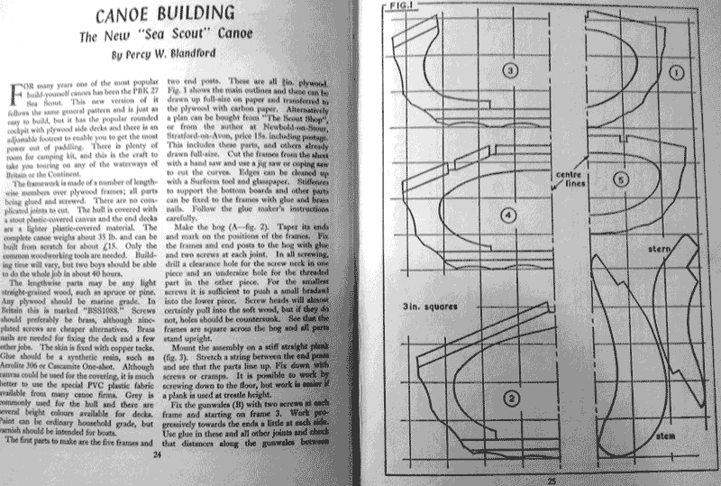 I had been wanting to build one for some time. Actually, a lot of time. You see the plans I used were published in the 1969 Scout Annual. An aunt gave me the book for Christmas that year. It did not take long to talk Dad into helping me build the canoe. After a quick trip to the lumberyard Dad was ripping out stringers and I was laboriously cutting out frames with a coping saw and dreaming about the adventures the boat would take me on. Unfortunately, the build went no further. When Mum saw what was going on she loudly proclaimed, "No son of mine is paddling out in the middle of a lake in a tiny boat made from bits of sticks and table cloth!" There was no point in arguing. A week or so later Dad surprised me with a set of plans for a Folbot Cayat, an all plywood, built like a battleship, decked canoe.